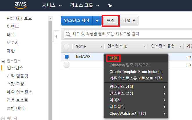 우선 해당 인스턴스에 마우스 우클릭 > 연결을 누르거나 혹은