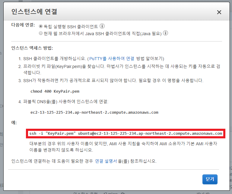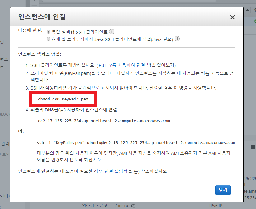 우선은 chmod 400 KeyPair.pem 이라는 부분을 주목해보자
