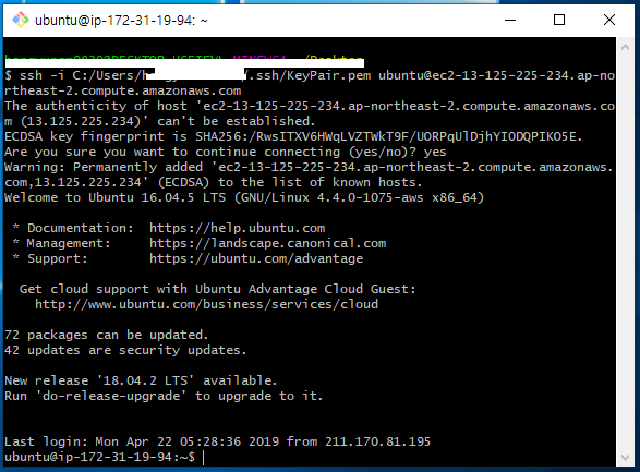 $ ssh -i {full path of your.pemfile} ubuntu@{instance IP address}