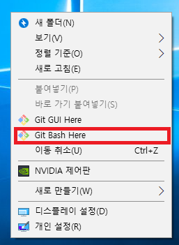 설치가 완료되었으면 바탕화면에서 마우스 우클릭 > Git Bash Here을 클릭해주자
