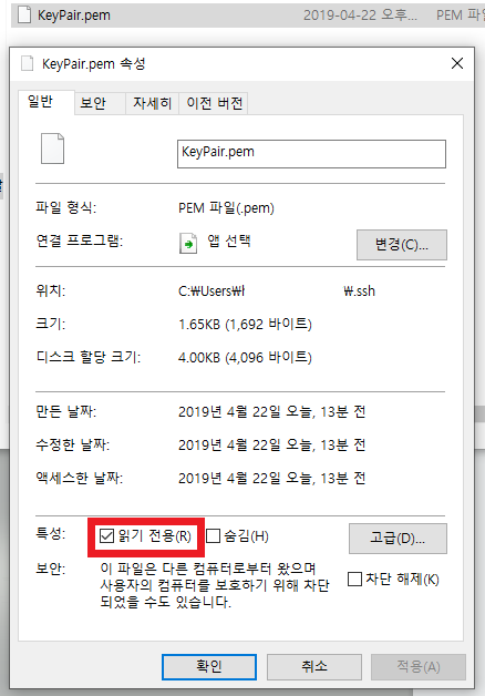 이부분은 뭐 별거 없다 처음 받았던 키 페어를 읽기전용 으로 바꾸라는 이야기이다.